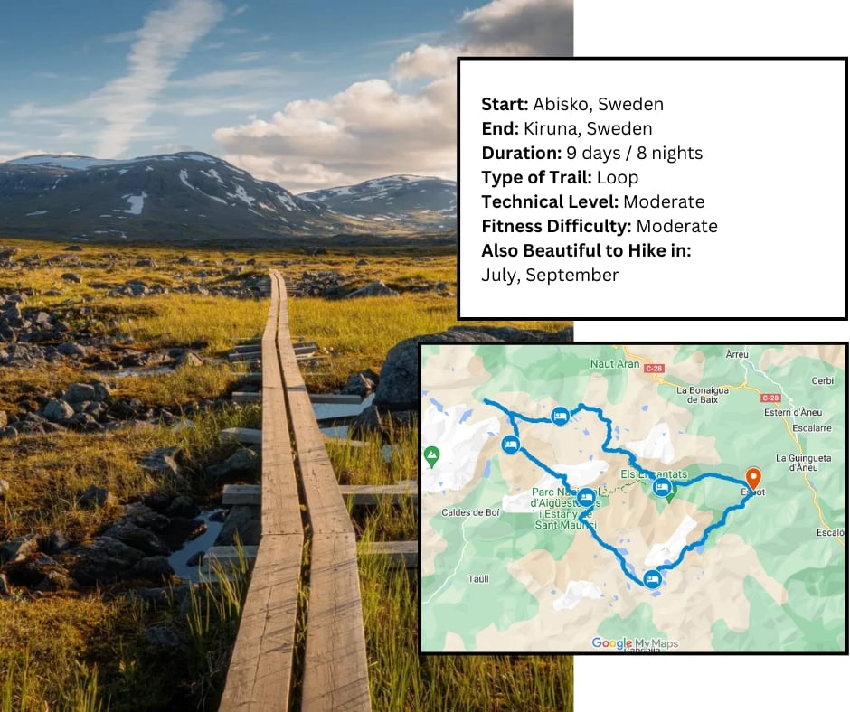 Stretching through Abisko National Park, this iconic trail takes you through breathtaking landscapes, with dramatic mountain vistas, serene rivers, and crystal-clear lakes.