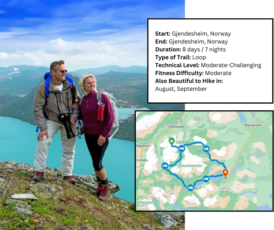 This remote trek offers a true sense of adventure, with stays in unique Norwegian huts that add a cozy, traditional touch to your journey. If you’re looking for a challenge with one-of-a-kind scenery, this is the trek for you!