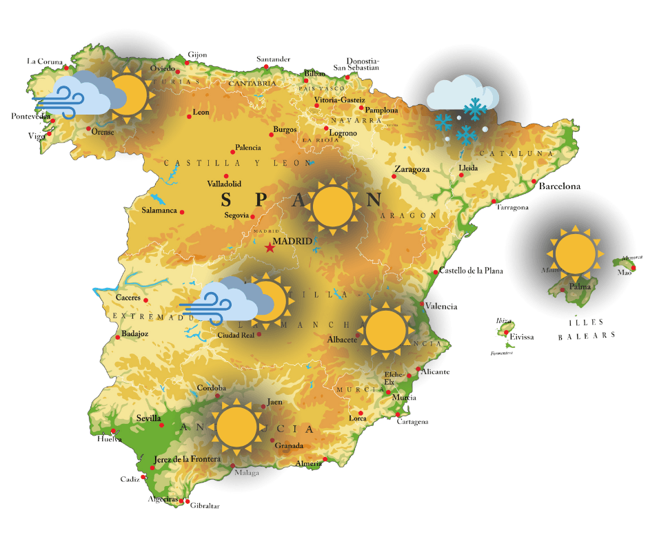 At tjekke vejrudsigten, før du tager afsted, er essentielt, især i Spanien, hvor forholdene varierer meget mellem regionerne — fra varme, tørre sletter i Andalusien til køligere, regnfulde nordkyster og uforudsigelige bjergpas i Pyrenæerne.