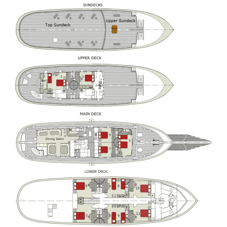 Cesarica is built for comfort, offering one of the highest space-per-guest ratios in its class. With 11 cabins on a 41-meter yacht, guests enjoy a relaxed, boutique-style sailing experience. Mahogany walls and floors lend a warm, classic feel, while sleek marble bathrooms and modern amenities offer elevated comfort. Each cabin is fully air-conditioned and equipped with a TV, safe, desk, reading sconces, and ample storage.