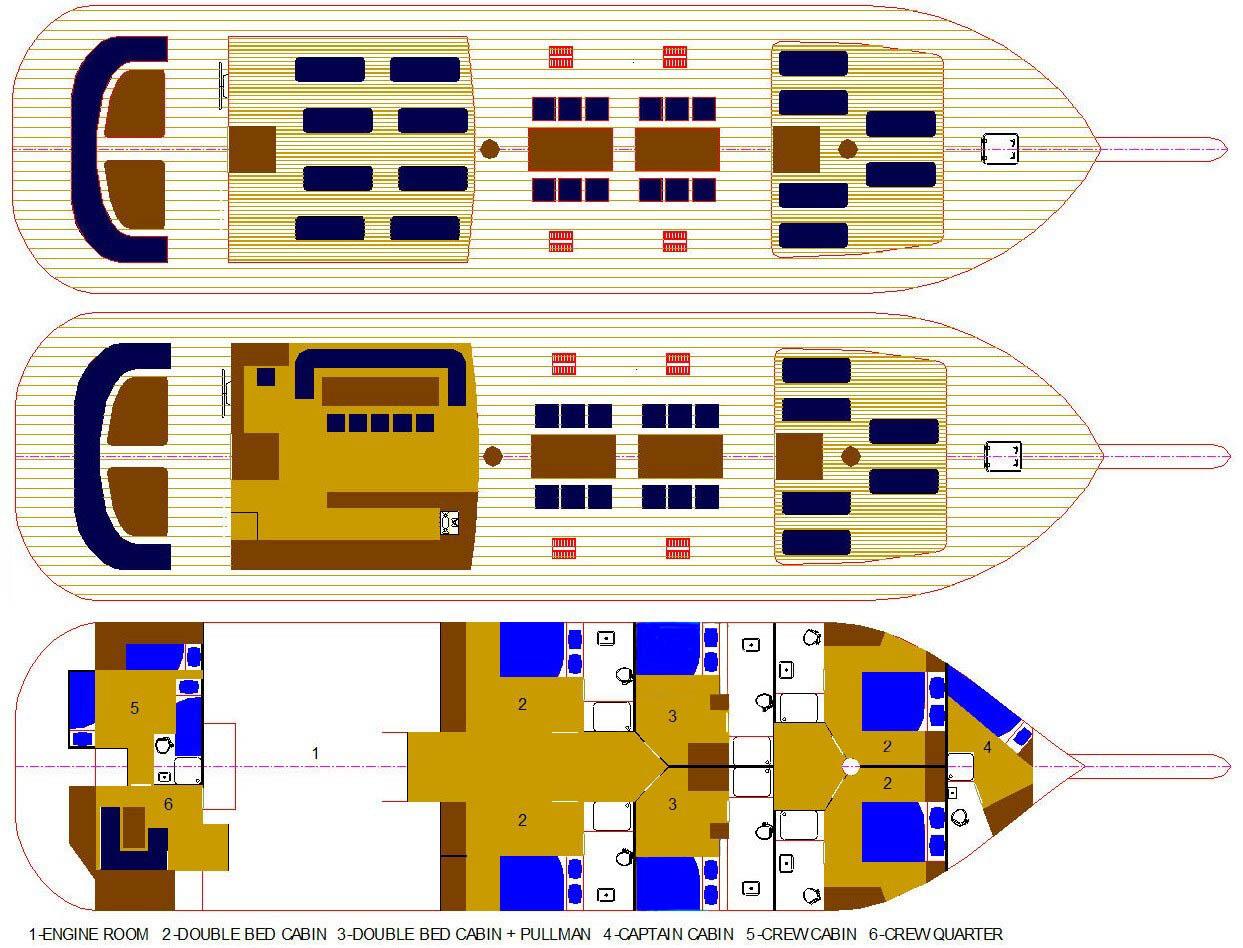 Libra welcomes up to 12 guests in 6 elegant, air-conditioned cabins, each with an en-suite bathroom and thoughtfully designed for both comfort and style. Opening portholes provide natural light and a refreshing sea breeze, while warm wood finishes and nautical décor create a cozy, maritime feel.