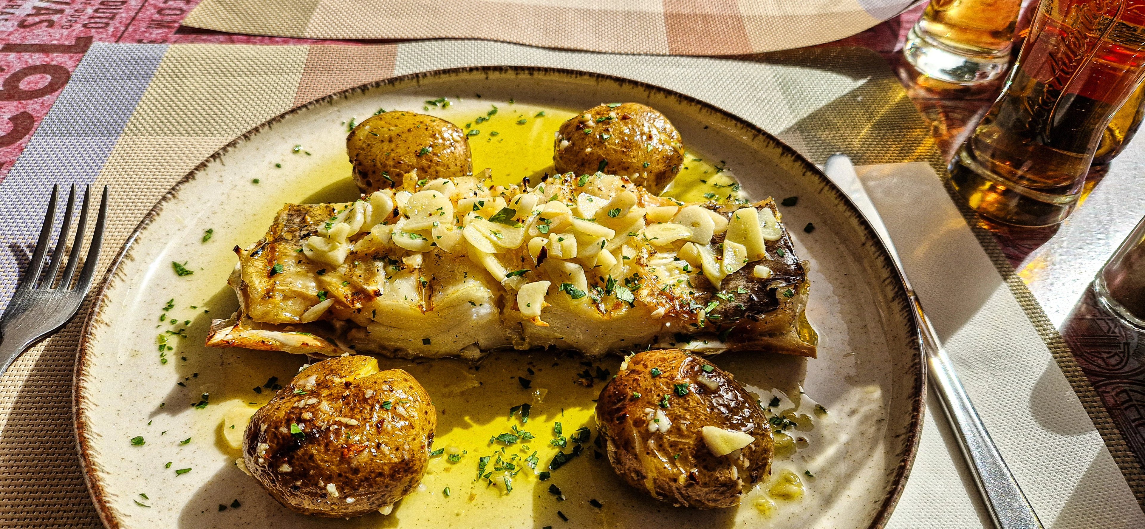 We hadden gegrilde vis, iets groens aan de zijkant, en wezen naar een random gerecht dat de ober aanbeval. Geen idee wat het was — maar het was geweldig. Obrigada, Portugal. Voeg twee glazen wijn toe, en zo waren we volledig in vakantiesfeer.