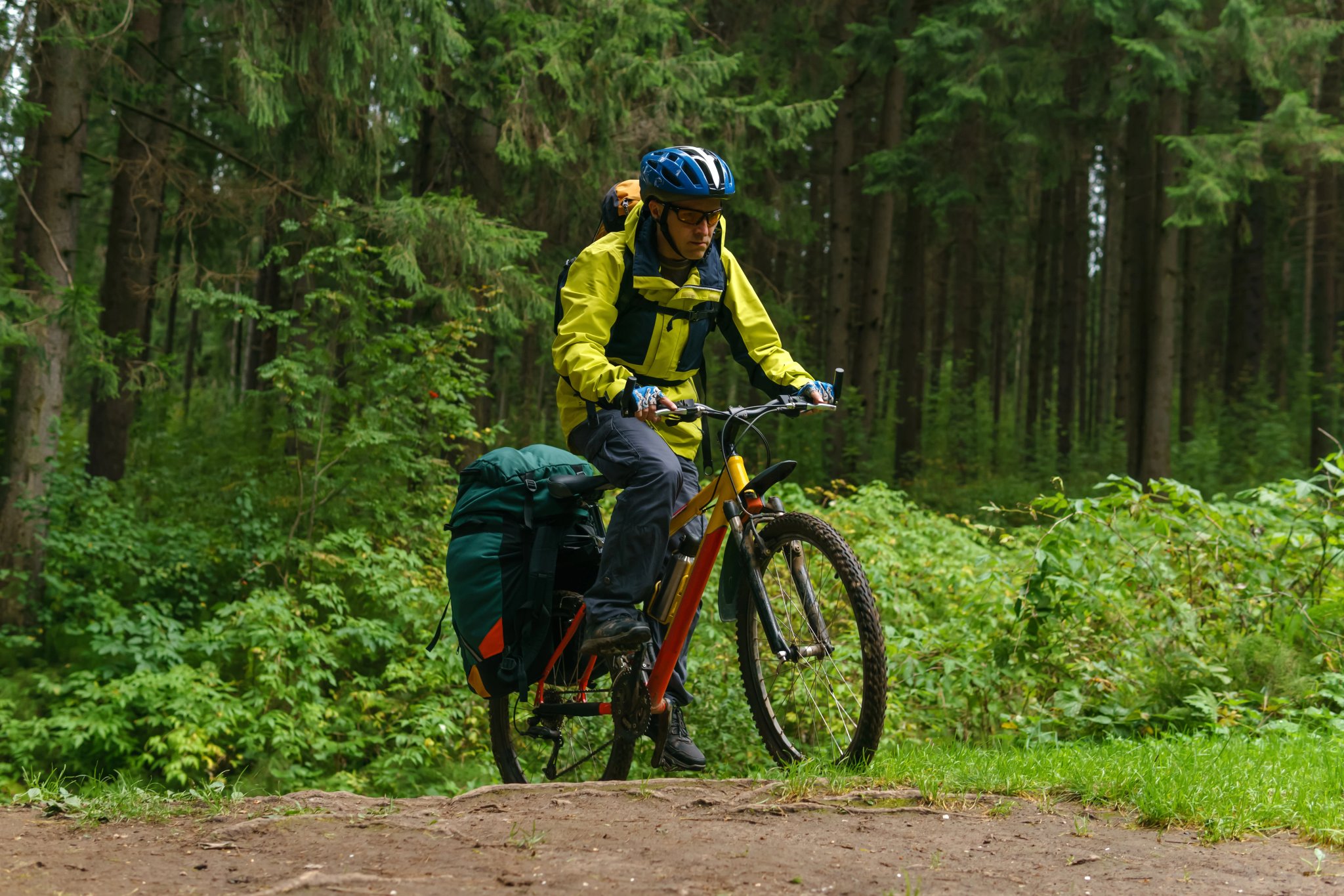 Fietsuitrusting: Gevoerde shorts, ademende shirts, lichte windjack en een goede regenjas voor de veranderlijke bergomstandigheden.